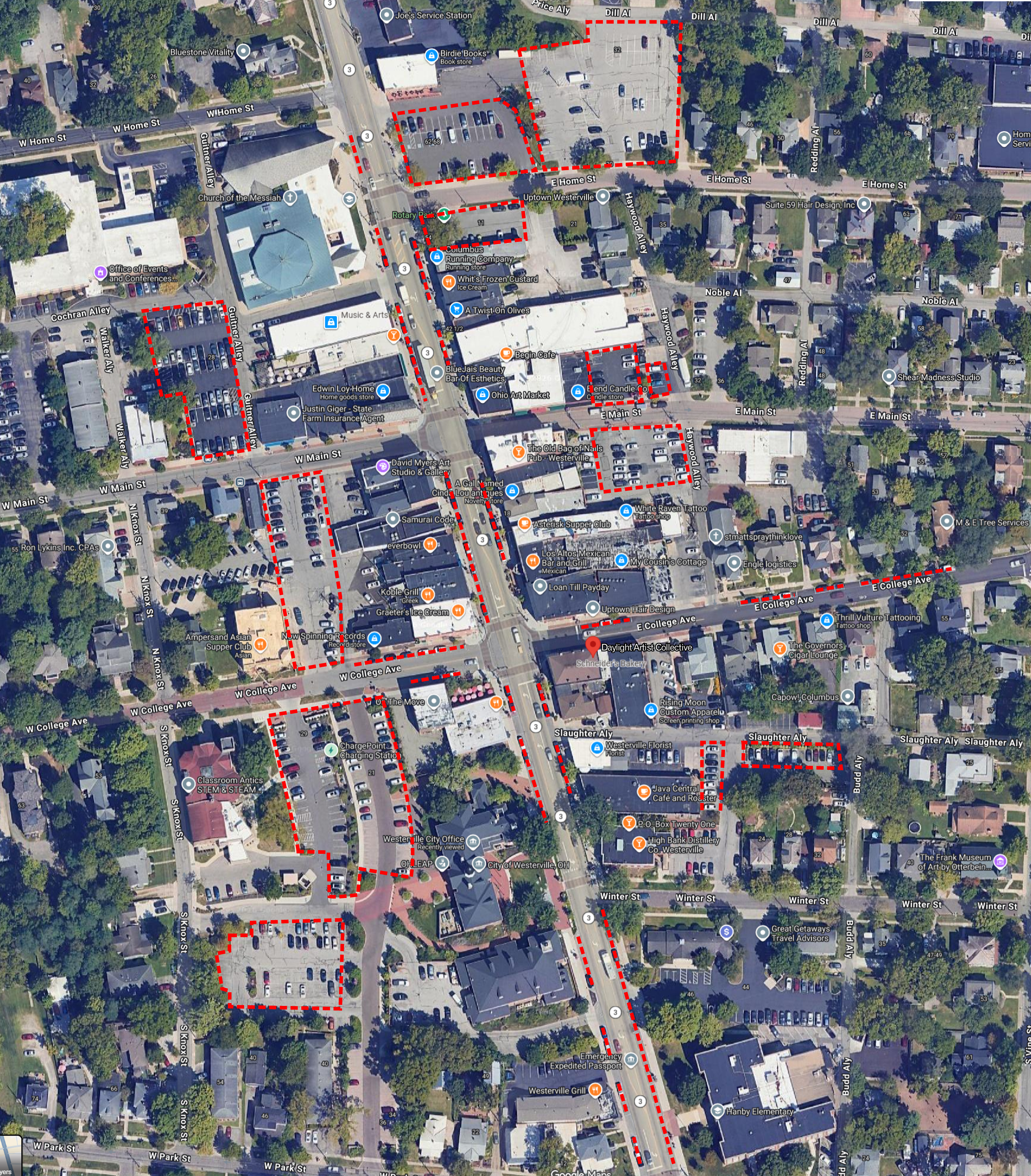 Parking in Uptown Westerville is public but spread out. Street parking directly in front of the building is limited, so please plan accordingly. This map shows where public parking areas are nearby the Daylight Artist Collective. Look for the Blue Public parking signs.